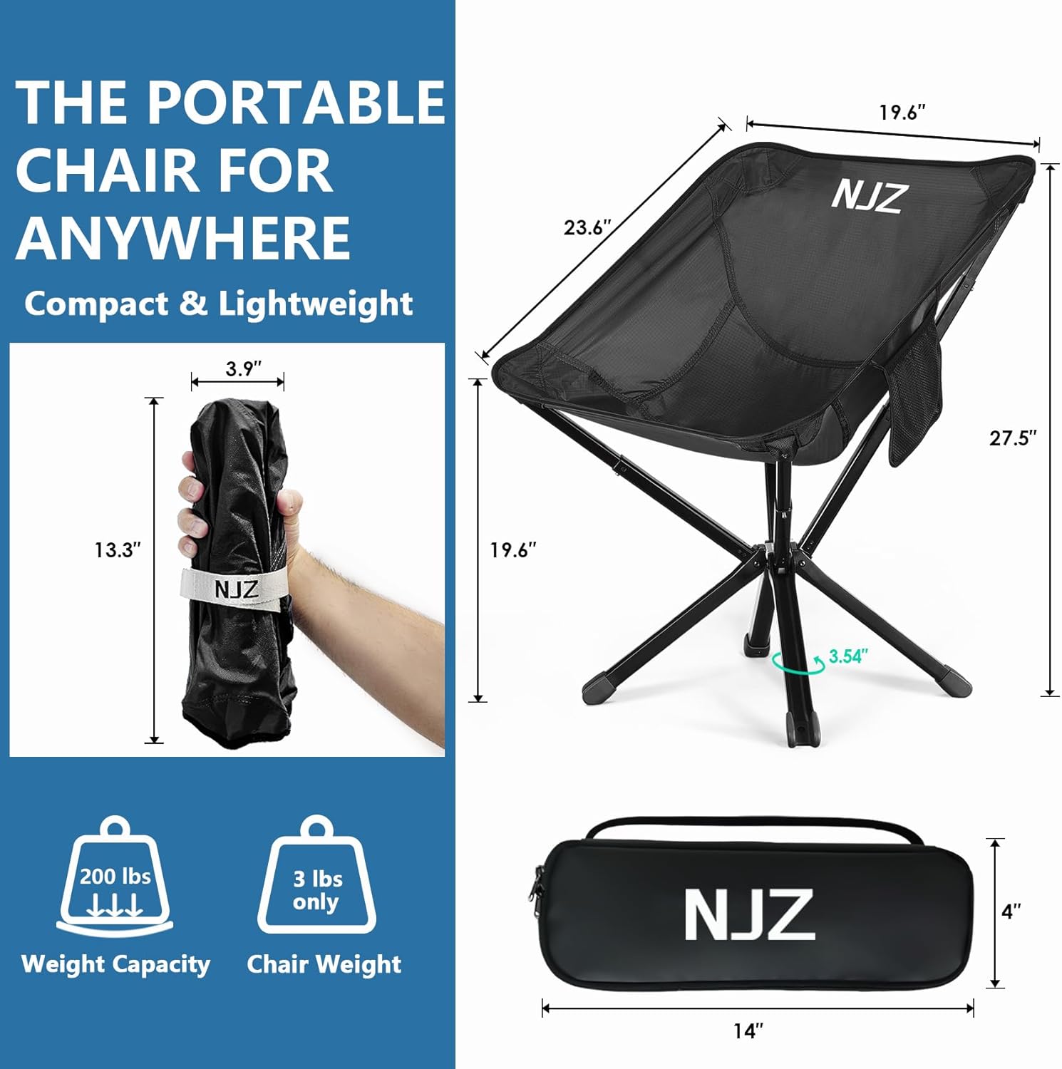 Lightweight Camping Chairs – Set up in 15s, Collapses to 13 Inches – Portable Folding Chair with Carry Bag, Backpacking Chair, Outdoor Chair for Hiking, Camping, Support 200 LBS – Black